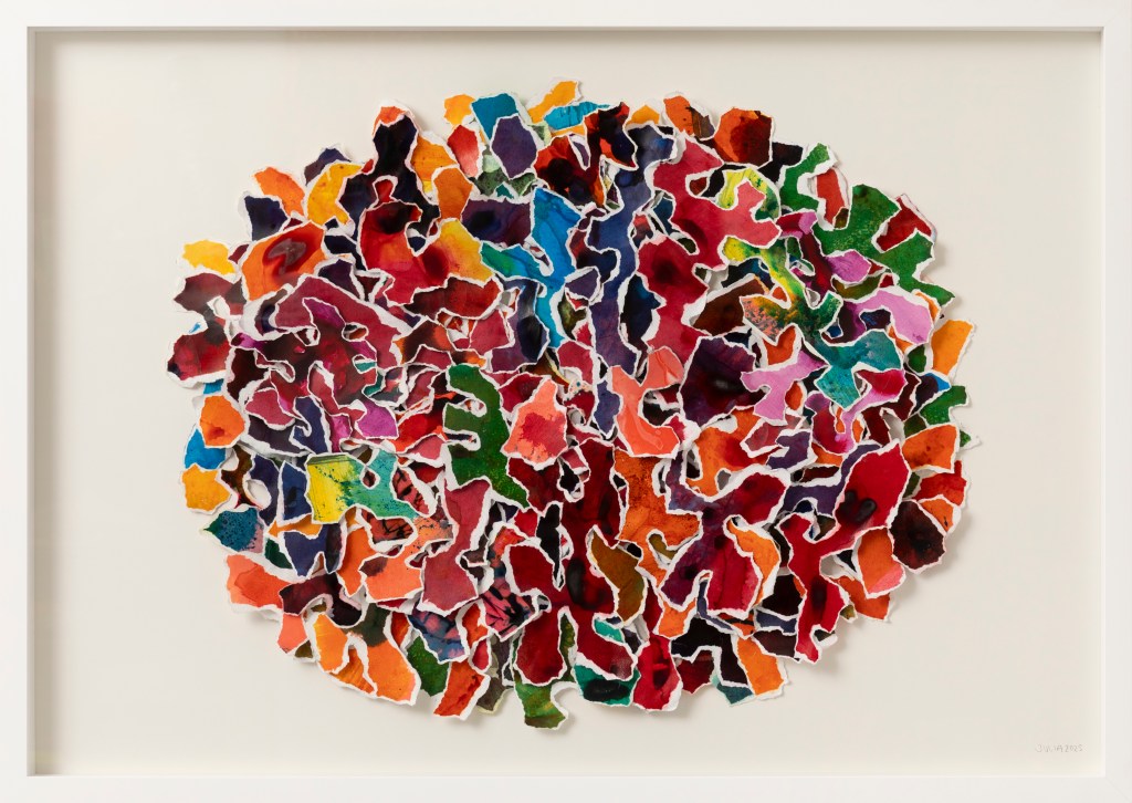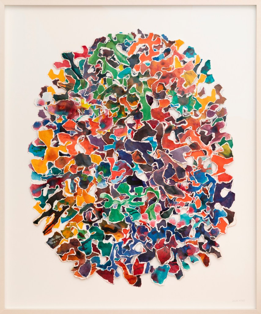 paper Echoes of Nature | Collage: Ink on paper | 101 x 82 cm (unframed) 120 x 100 cm (framed) | 2025 Unwind | Collage: Ink on Paper | ca. 112 x 112 x 30 cm | 2025 Coral Pulse | Collage: Ink on Paper | 60 x 75 cm | 74 x 104 cm (framed) | 2025